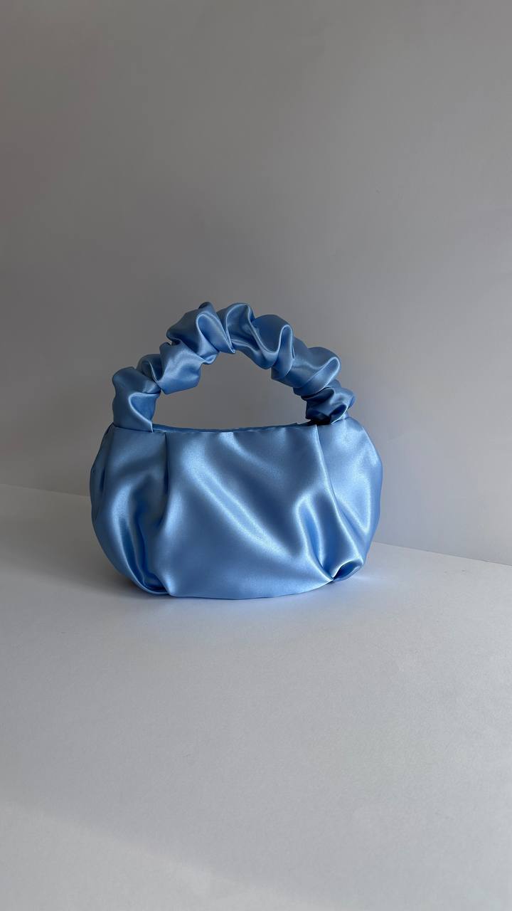 This elegant handbag is crafted from smooth, satin-finish fabric with a soft, luxurious sheen. Its structured yet supple silhouette is enhanced by a gathered design and a distinctive ruched top handle, giving the bag a modern and feminine character.