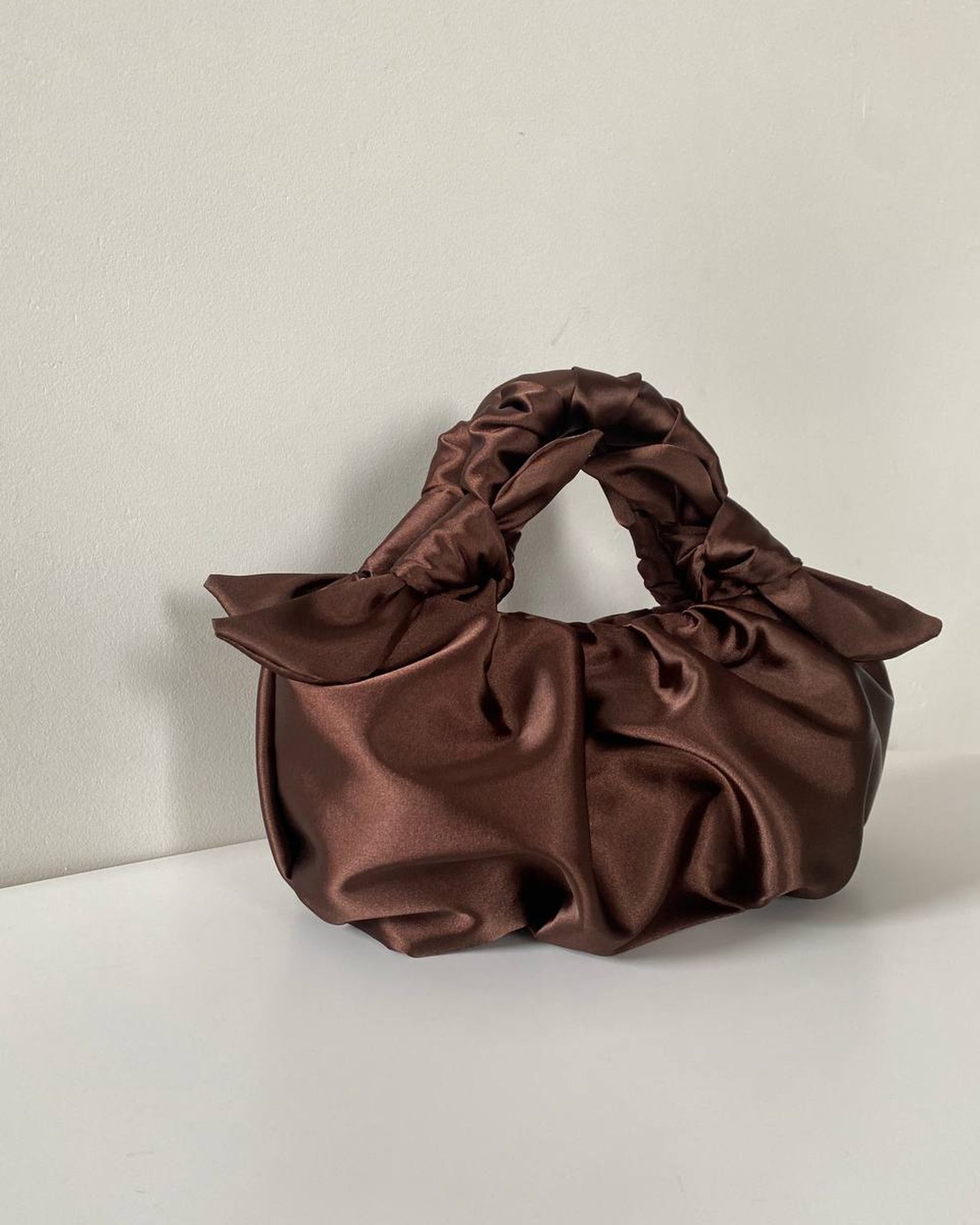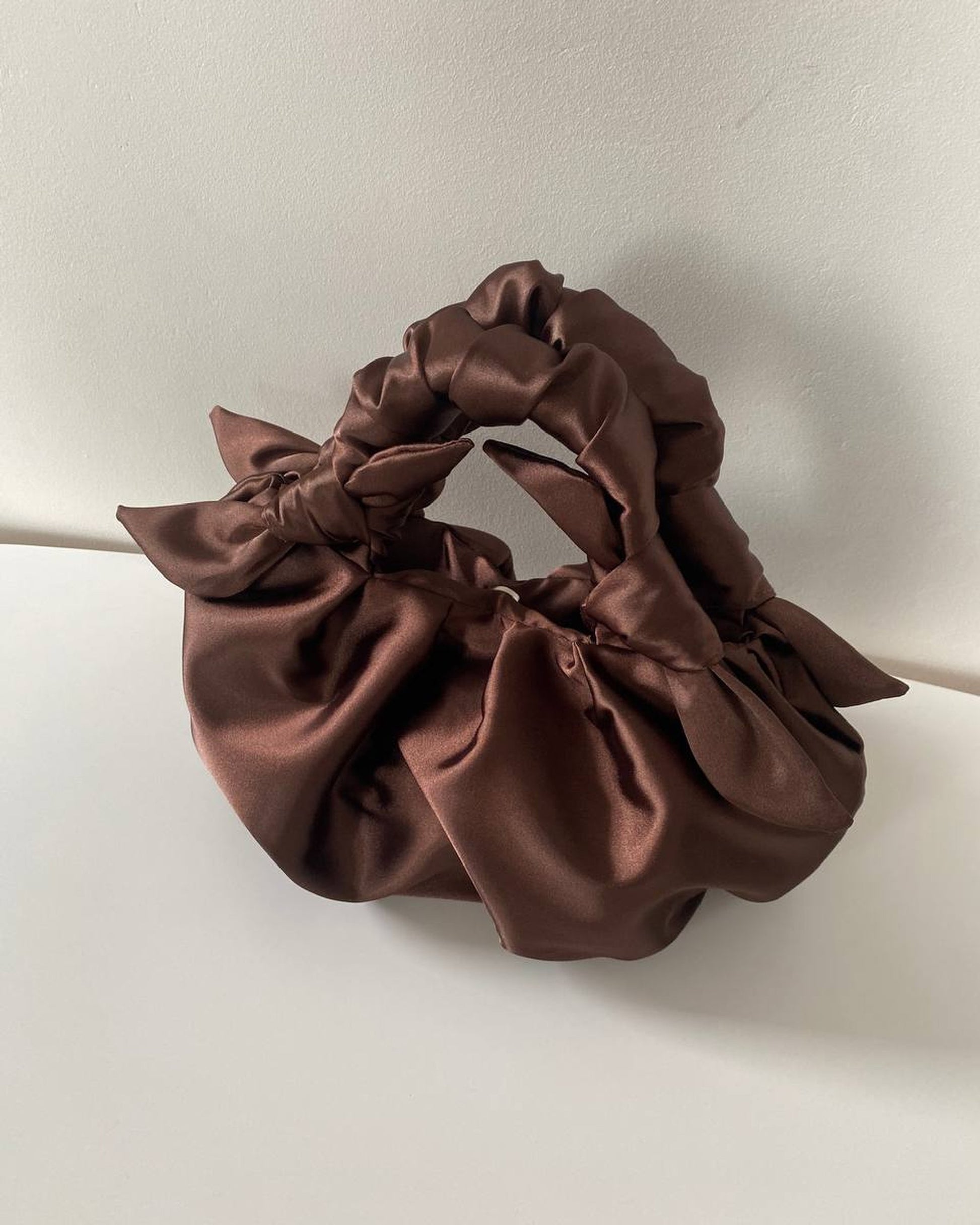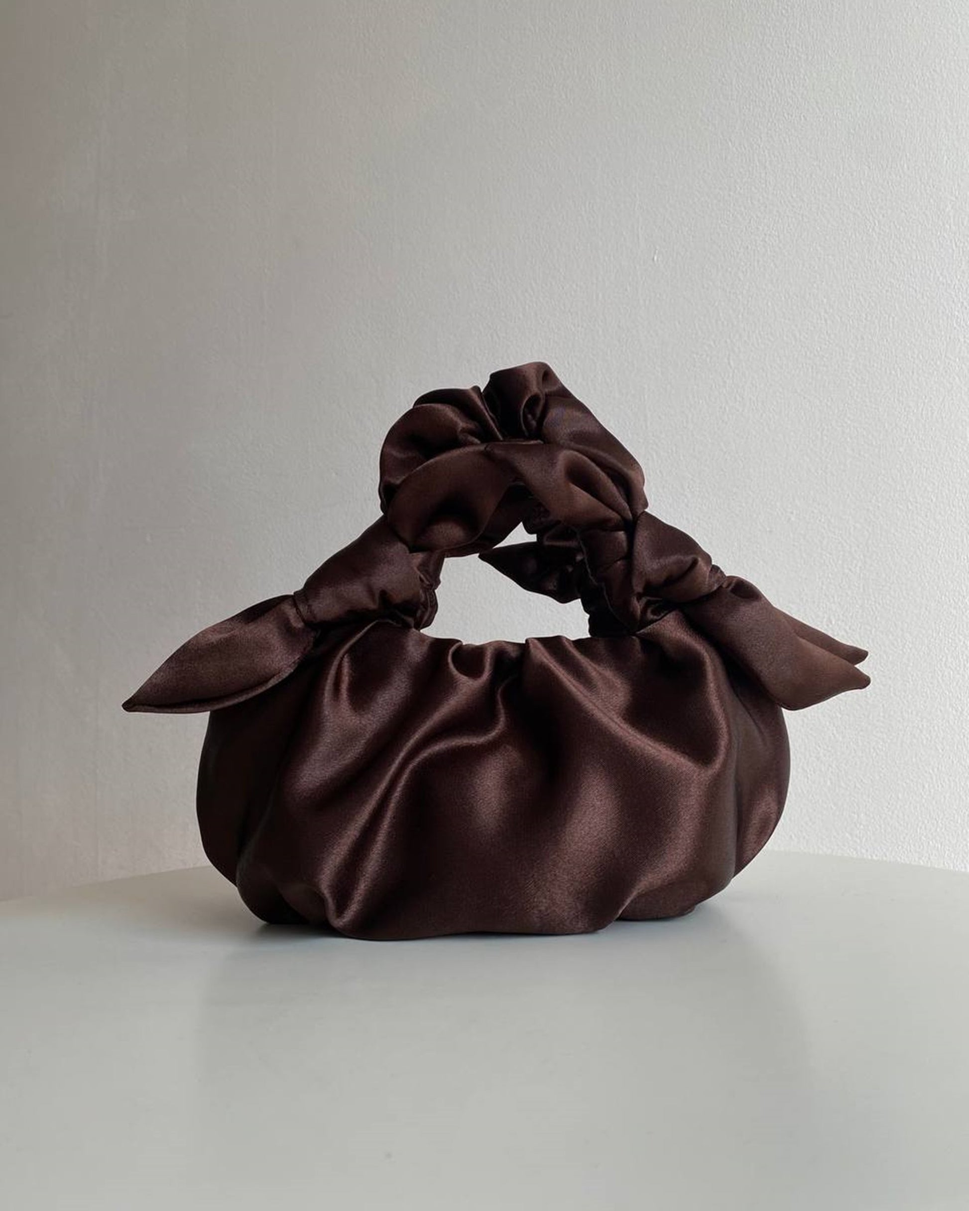 Beautiful bag with knots crafted from smooth satin. Woman bag is soft, but keeps its shape, closes with a magnetic button. Stylish satin bag is made in vintage style, based on the japanese technigue of tying a silk scarf in a bag. This cute little handbag is very versatile, it can be worn not only to formal events, it will add elegance to your most casual looks. Perfect wedding bag.