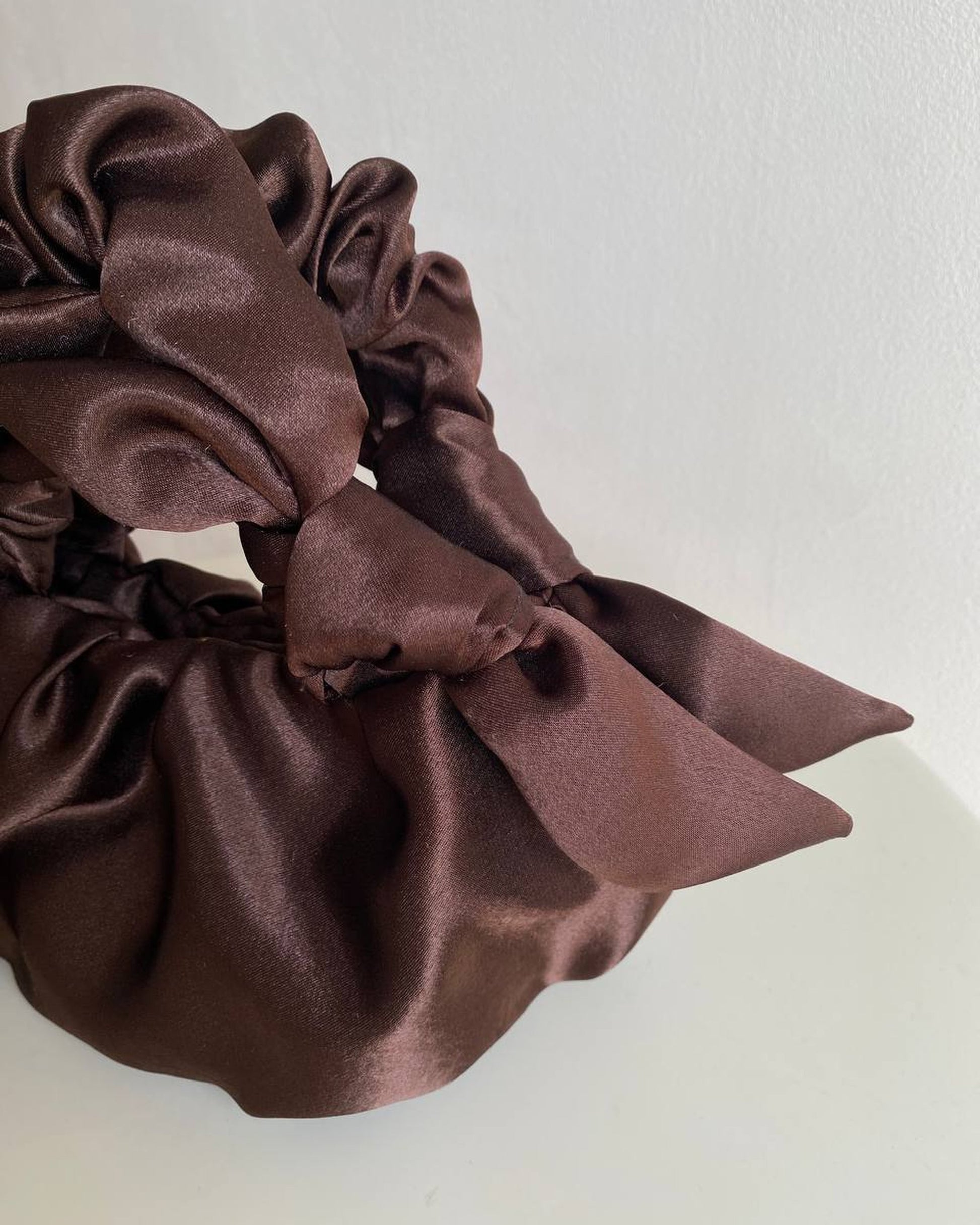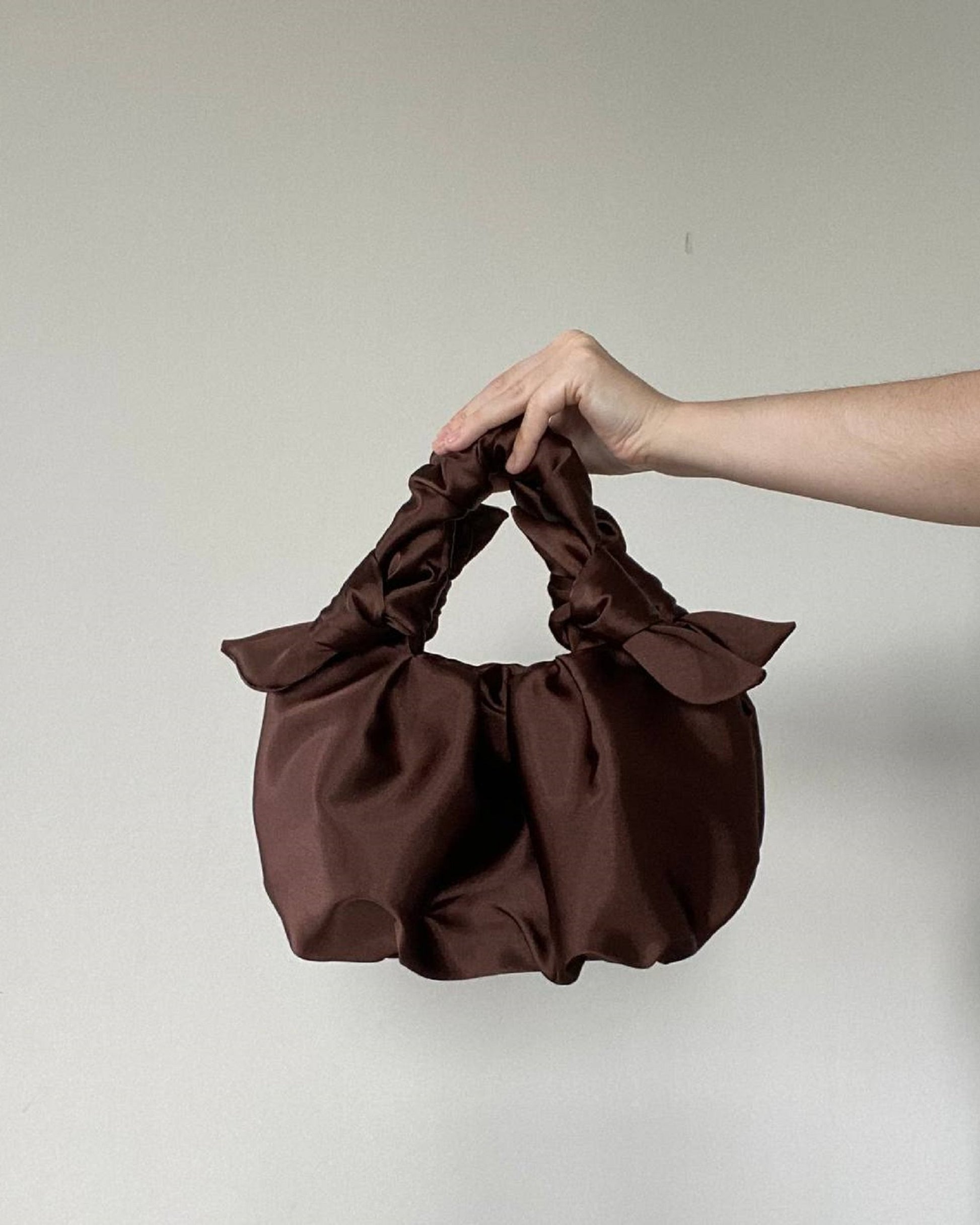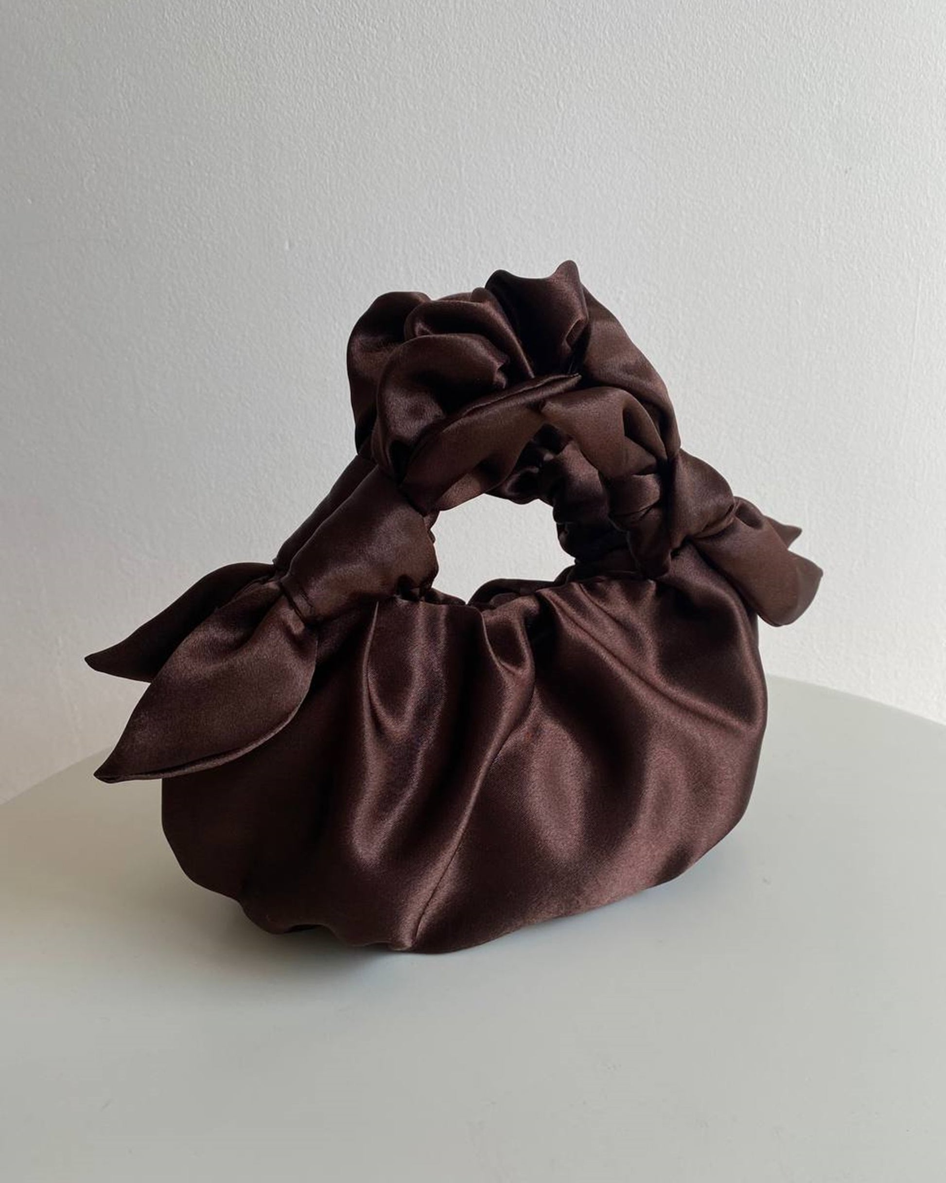 Beautiful bag with knots crafted from smooth satin. Woman bag is soft, but keeps its shape, closes with a magnetic button. Stylish satin bag is made in vintage style, based on the japanese technigue of tying a silk scarf in a bag. This cute little handbag is very versatile, it can be worn not only to formal events, it will add elegance to your most casual looks. Perfect wedding bag.