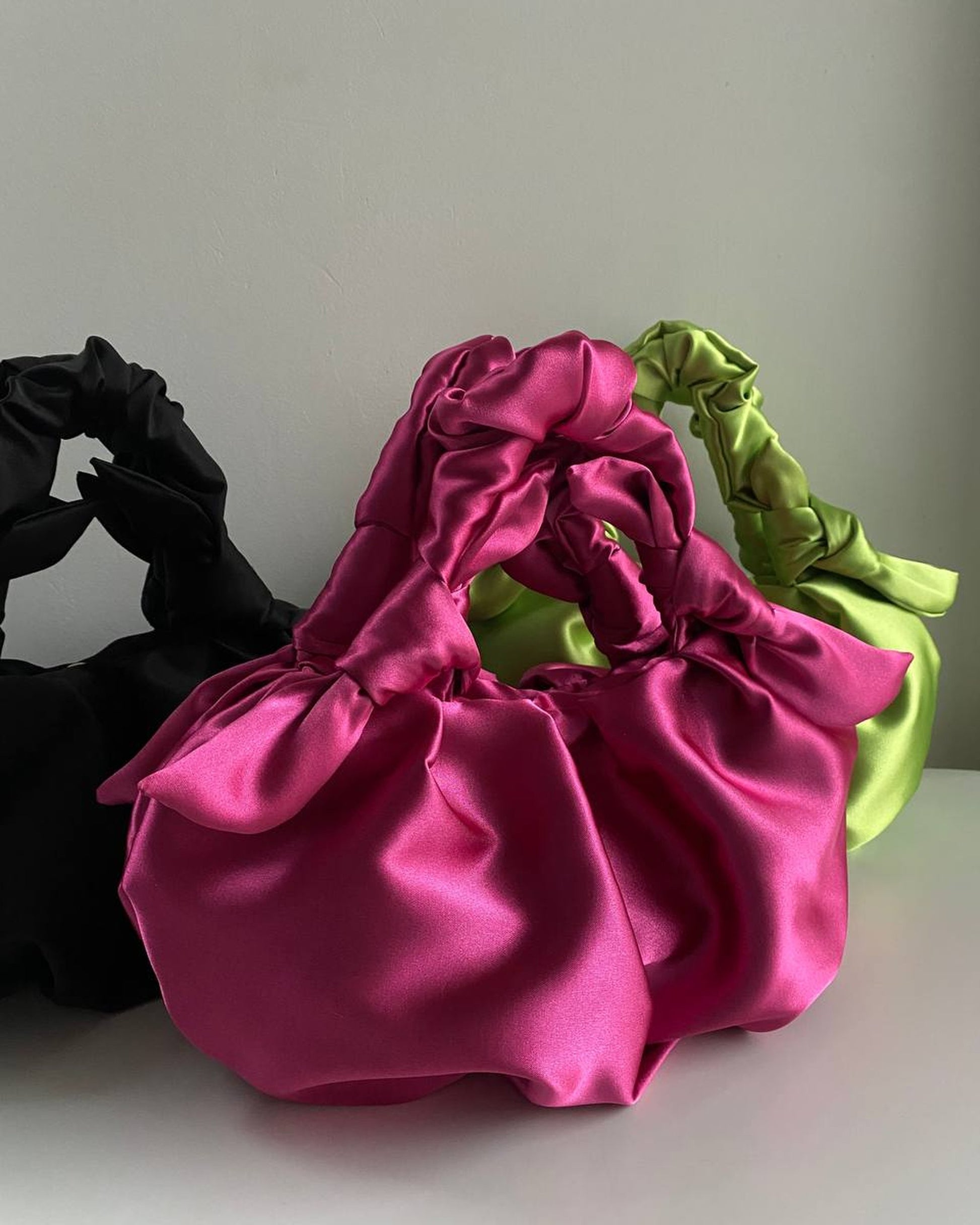 Beautiful bag with knots crafted from smooth satin. Woman bag is soft, but keeps its shape, closes with a magnetic button. Stylish satin bag is made in vintage style, based on the japanese technigue of tying a silk scarf in a bag. This cute little handbag is very versatile, it can be worn not only to formal events, it will add elegance to your most casual looks. Perfect wedding bag.