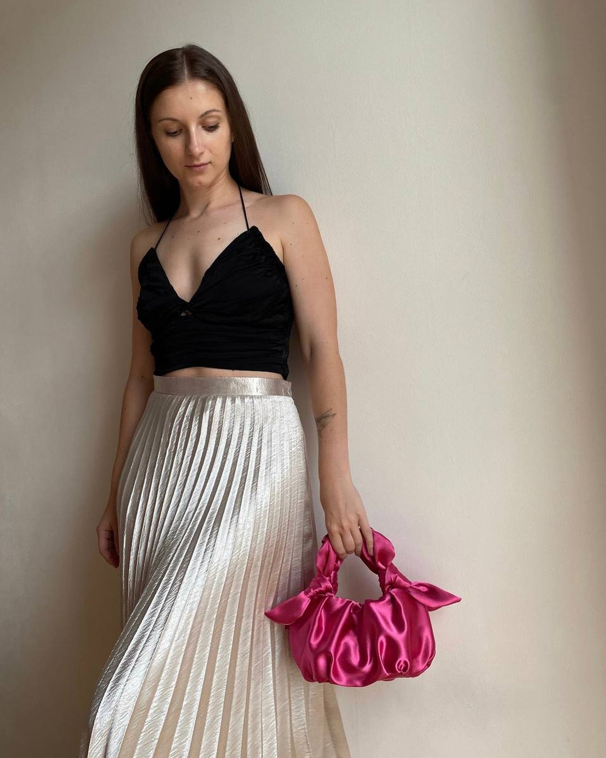 The handbag consists of 3 layers: the outer material and the lining are satin, with a special seal between them so that the handbag keeps its shape.