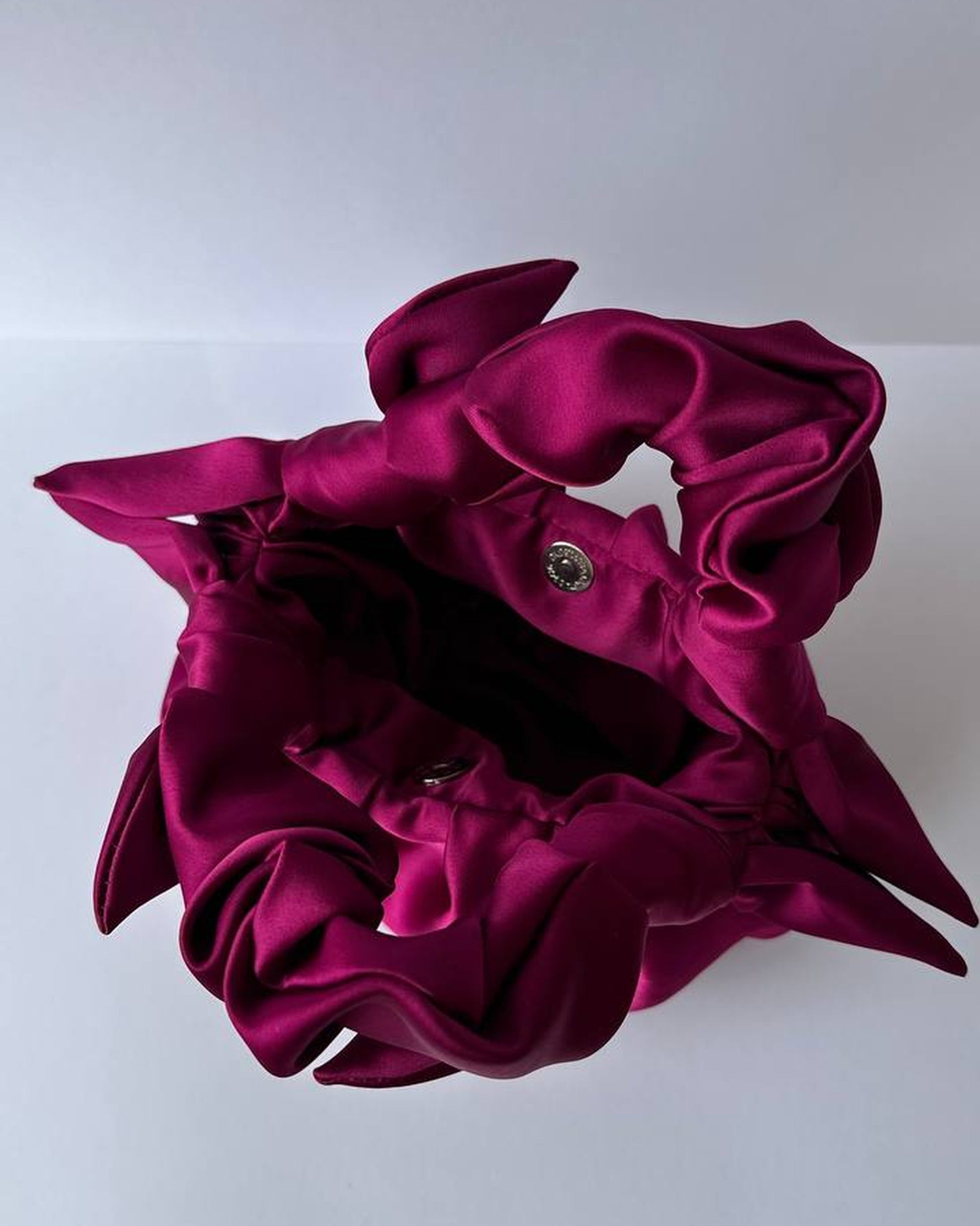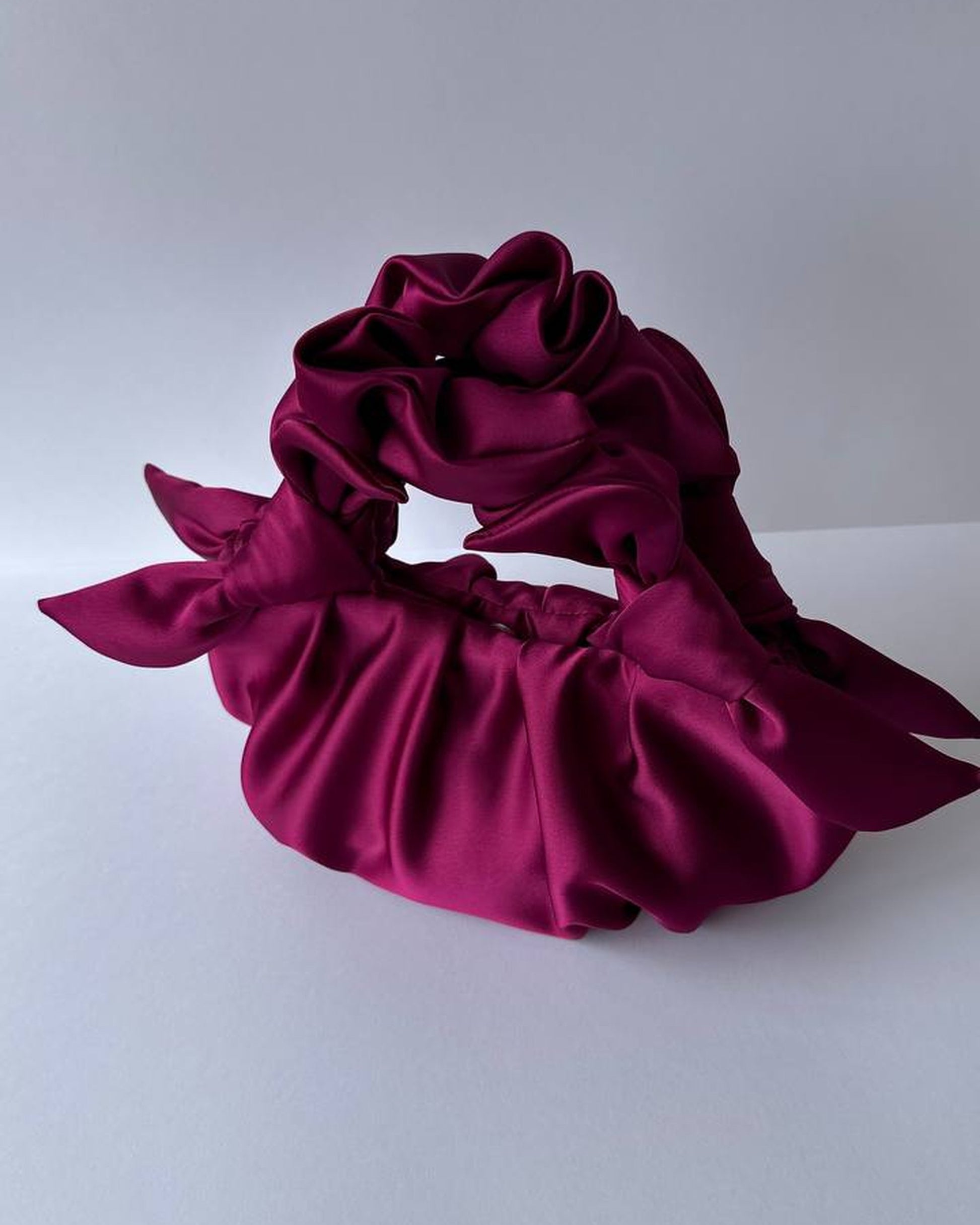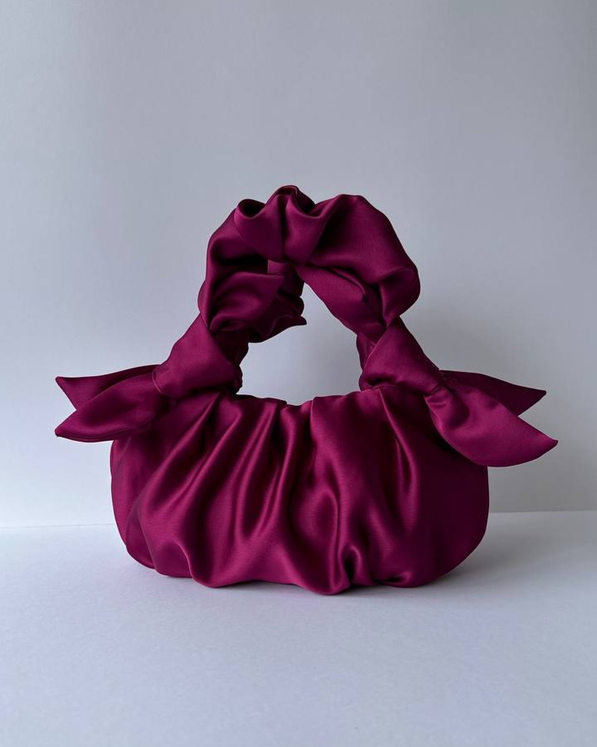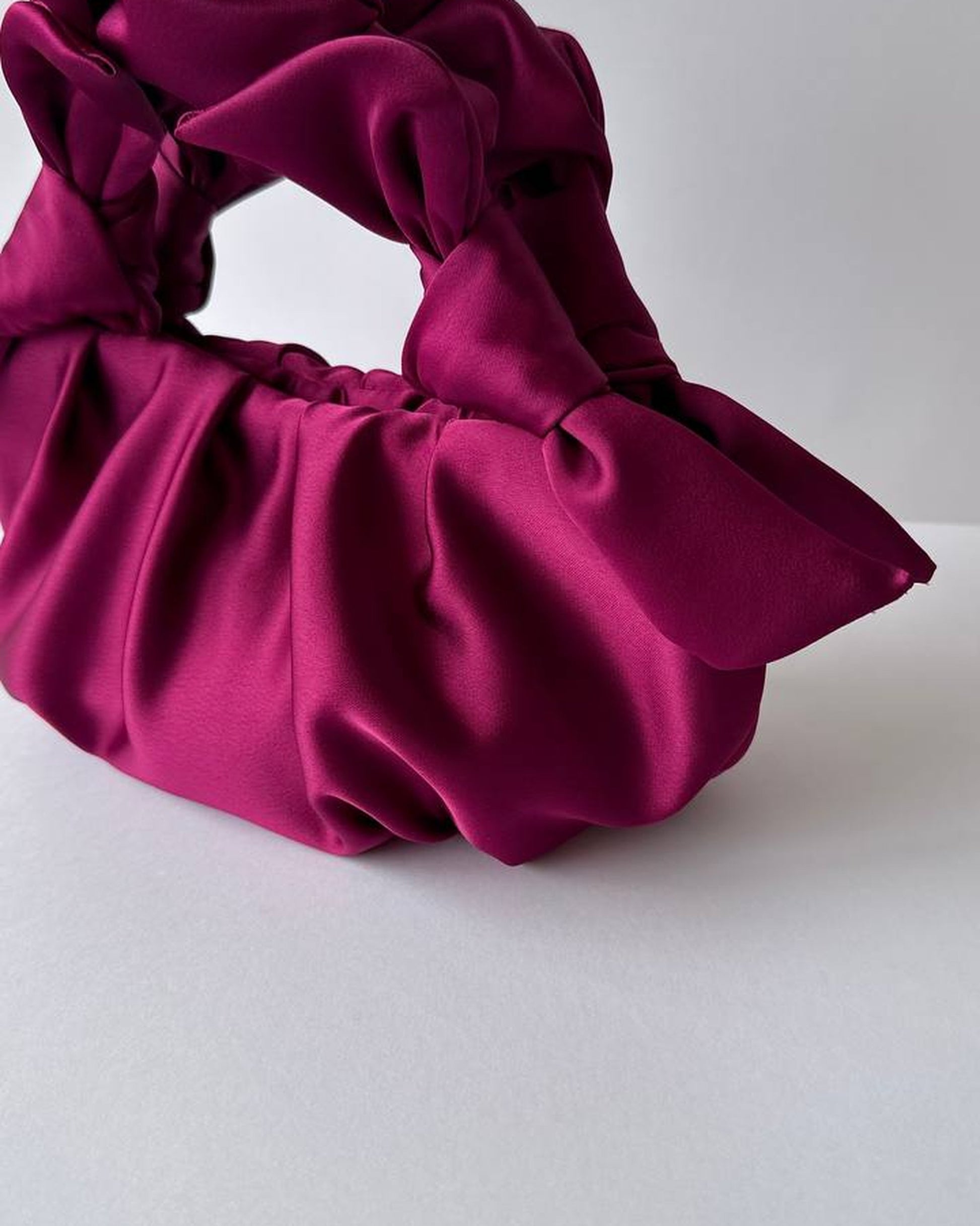 Beautiful bag with knots crafted from smooth satin. Woman bag is soft, but keeps its shape, closes with a magnetic button. Stylish satin bag is made in vintage style, based on the japanese technigue of tying a silk scarf in a bag. This cute little handbag is very versatile, it can be worn not only to formal events, it will add elegance to your most casual looks. Perfect wedding bag.