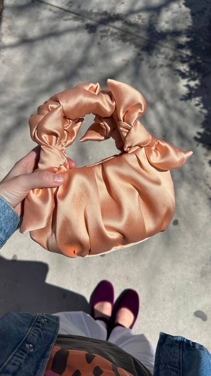 Beautiful bag with knots crafted from smooth satin. Woman bag is soft, but keeps its shape, closes with a magnetic button. Stylish satin bag is made in vintage style, based on the japanese technigue of tying a silk scarf in a bag. This cute little handbag is very versatile, it can be worn not only to formal events, it will add elegance to your most casual looks. Perfect wedding bag.