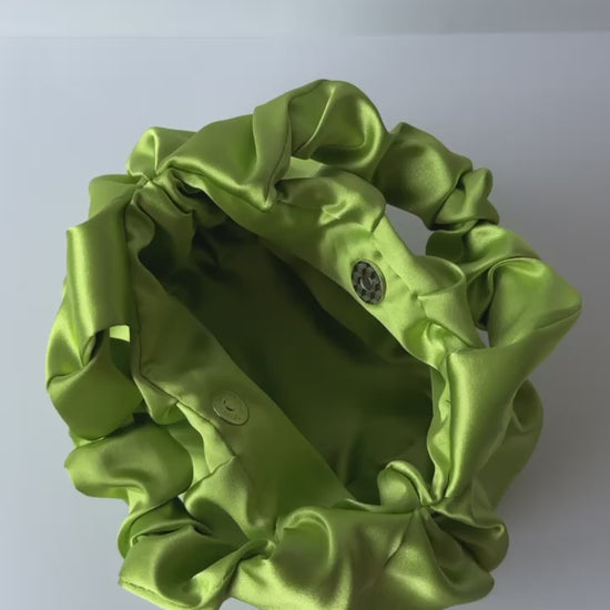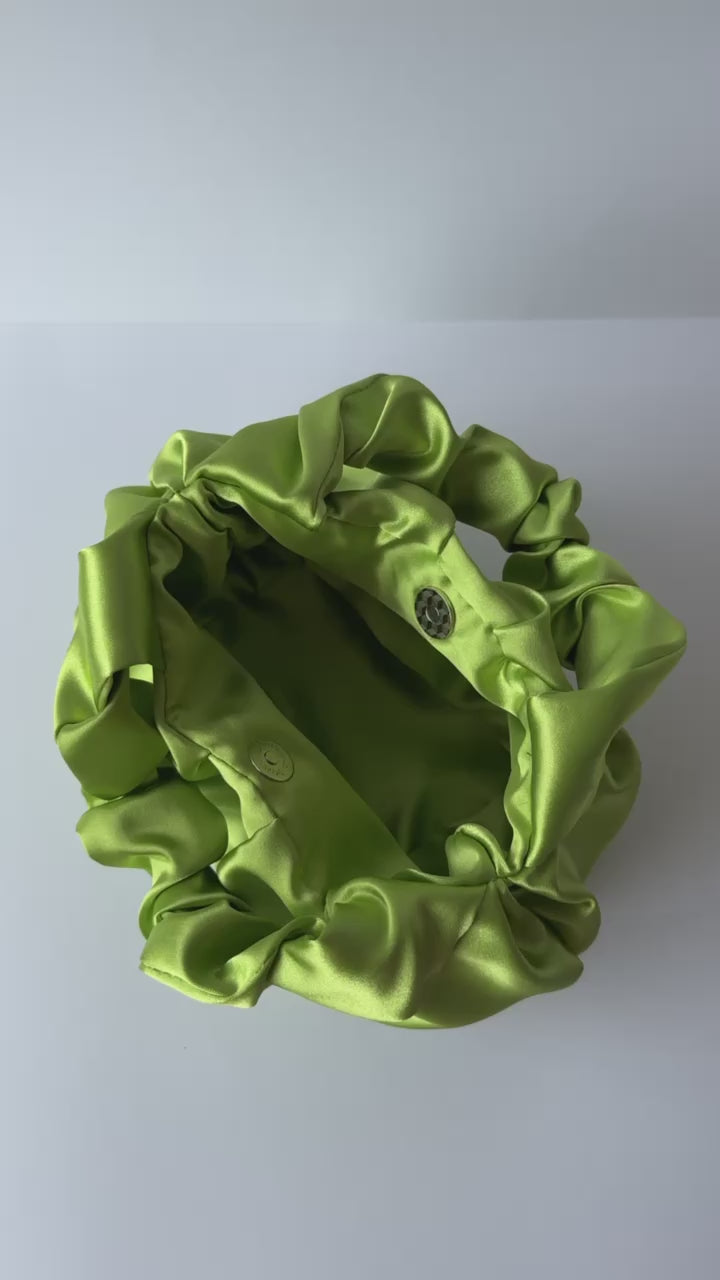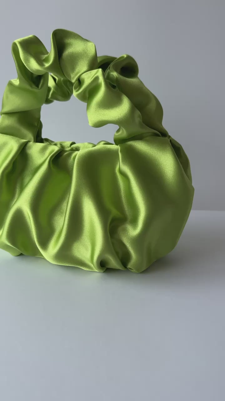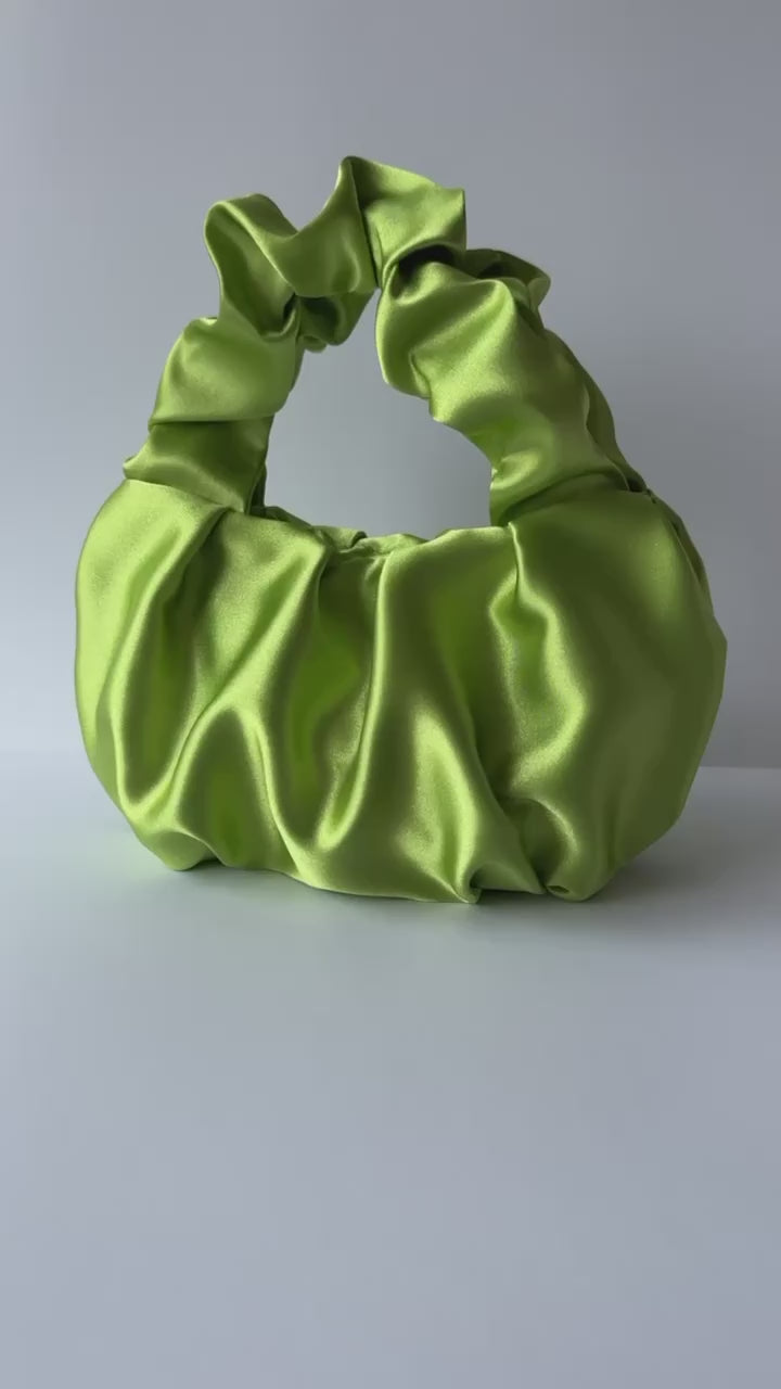 This elegant handbag is crafted from smooth, satin-finish fabric with a soft, luxurious sheen. Its structured yet supple silhouette is enhanced by a gathered design and a distinctive ruched top handle, giving the bag a modern and feminine character.
